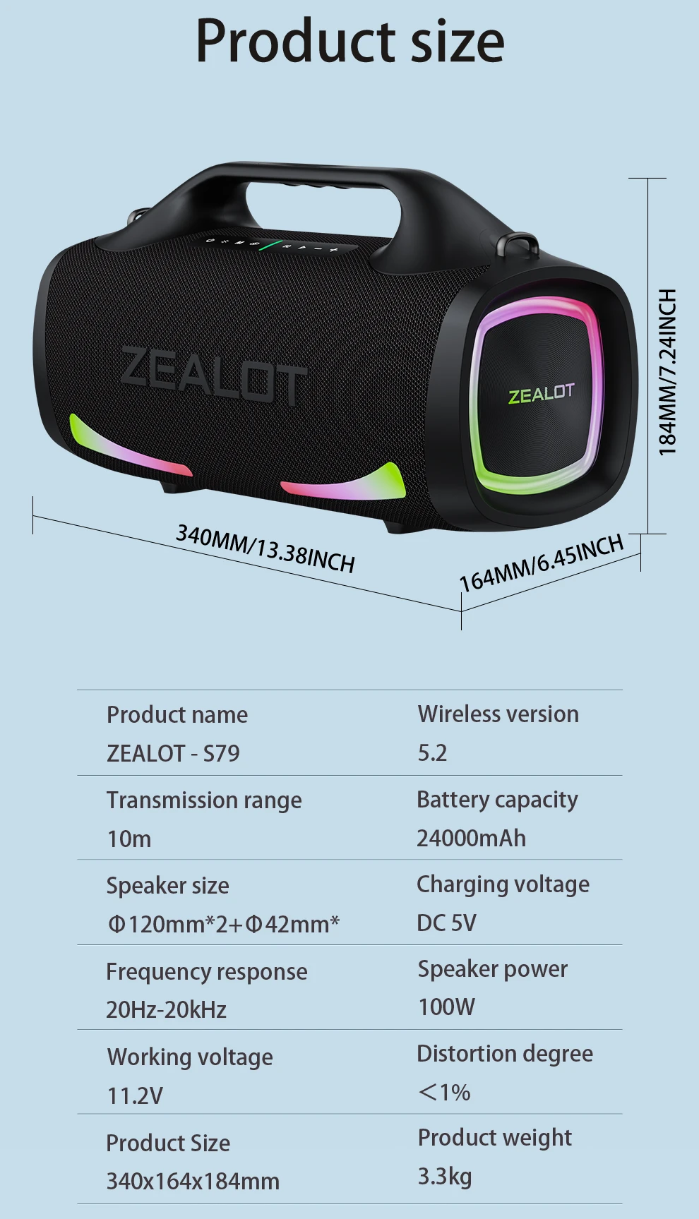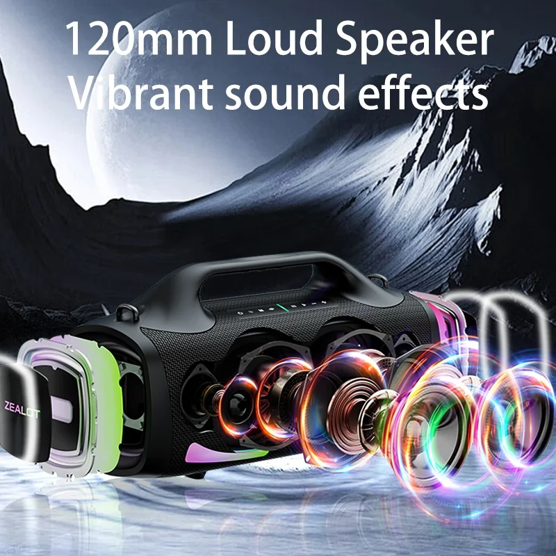 Experience “Rocking sound quality” and redefine your audio with the ZEALOT-S79, an “Extra Super Bass” wireless subwoofer speaker. Engineered for powerful performance, the S79 delivers a commanding 100W of high-fidelity audio, fueled by a massive 24000mAh battery, and illuminated by vibrant, colorful lights. Perfect for outdoor entertainment, large-scale activities, and immersive listening, this speaker ensures loud volume with “No broken sound.”