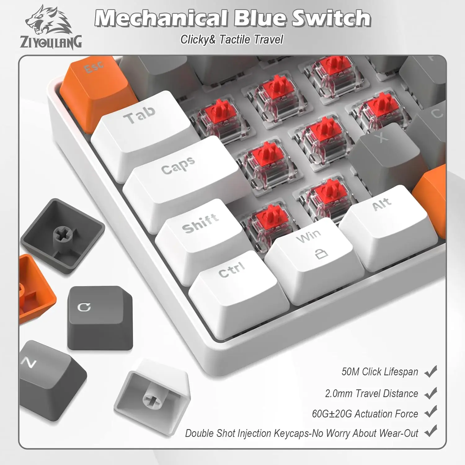 - Switch Type: Mechanical Blue, 60g ± 20g force, 2.0 mm travel