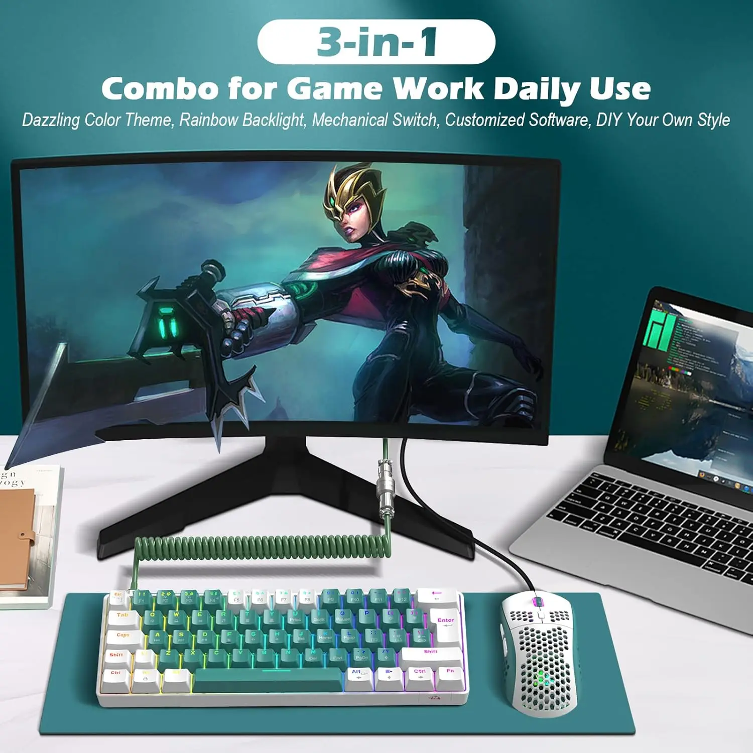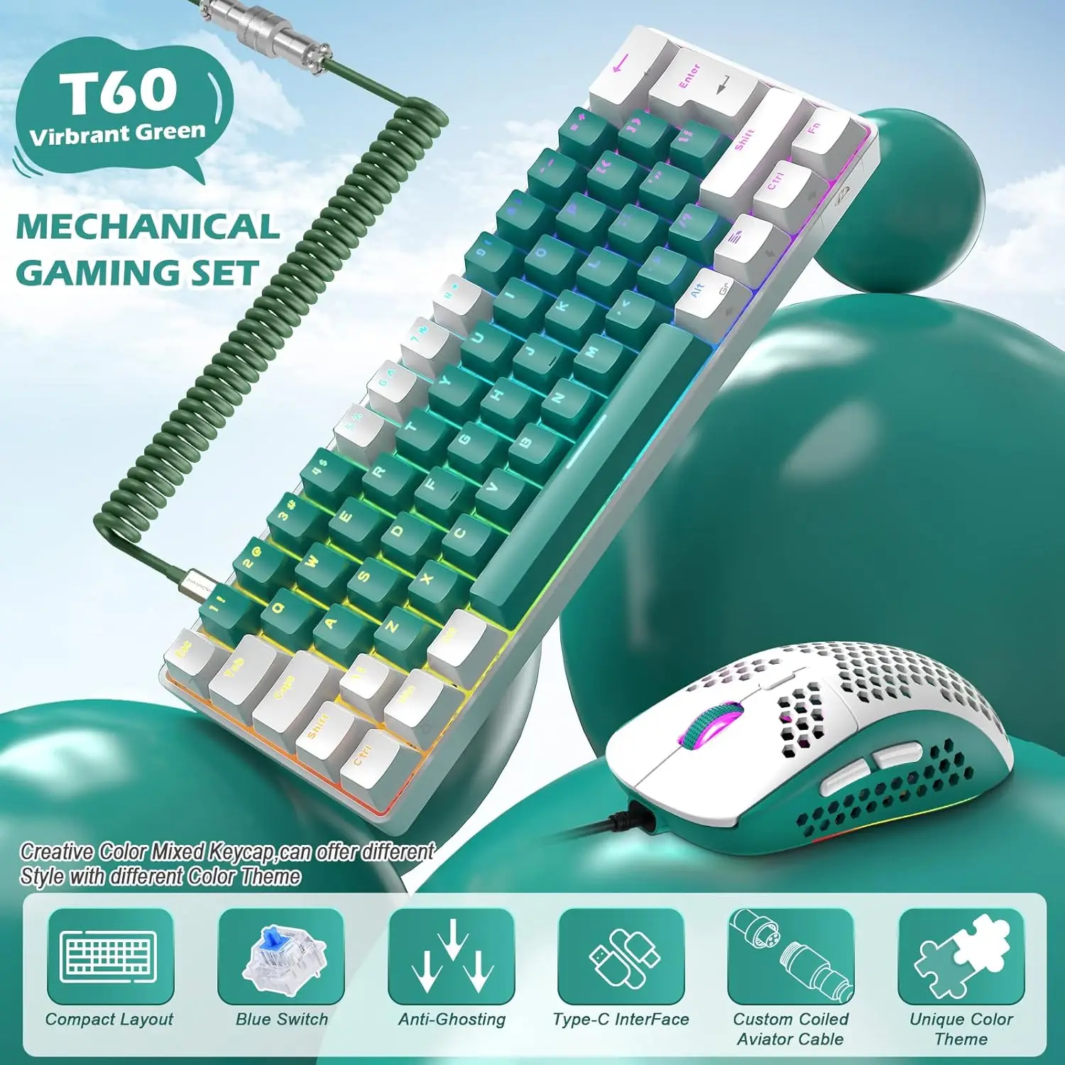 This all-in-one mechanical keyboard and mouse set combines bold aesthetics with professional-grade performance. Featuring clicky blue switches, a custom coiled aviator cable, and a high-DPI RGB backlit mouse, the T60 set is a fusion of form and function for gaming, work, or everyday use.
