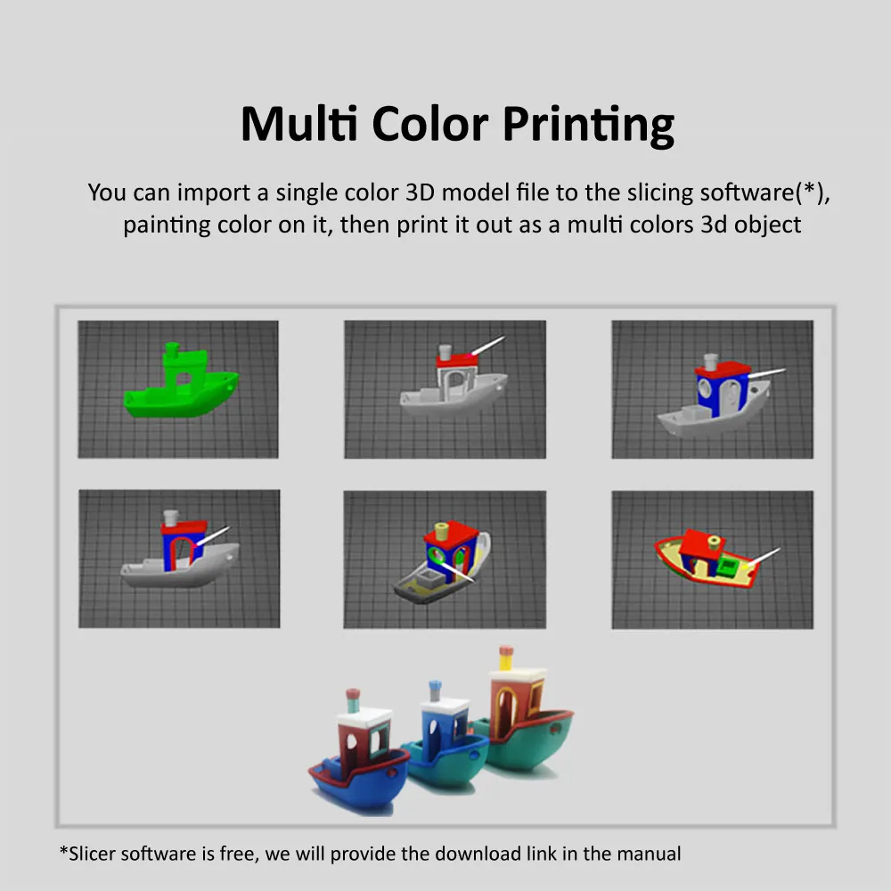 - Supports both single and multi-color printing with a built-in automatic color mixing feature. This allows for easy conversion of single-color 3D models into vibrant multi-color prints.