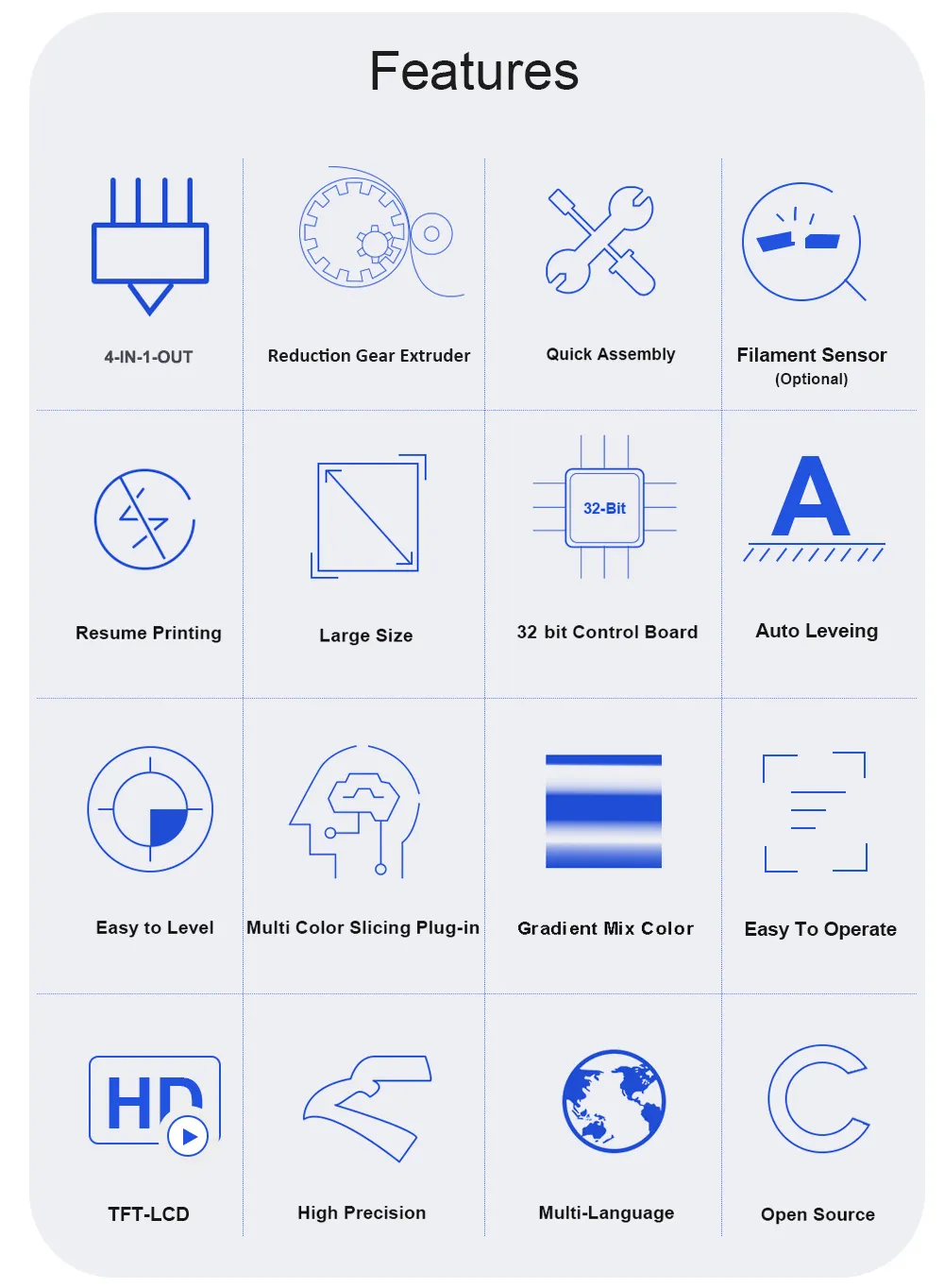 - 4-IN-1-OUT Non-Mixing-Color Hotend: Offers better color resolution for multi-color printing.