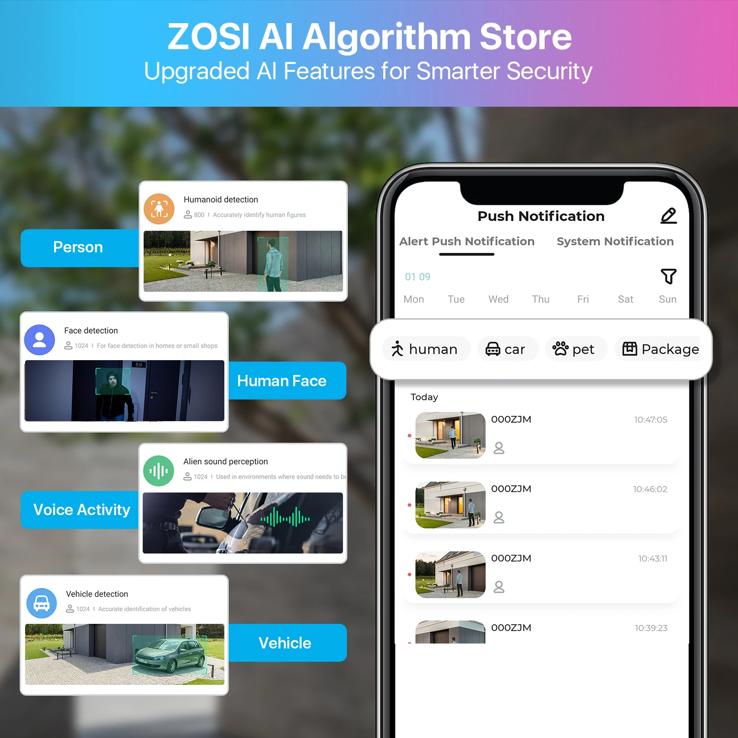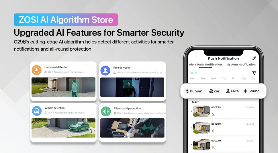 Thanks to C296’s cutting-edge AI algorithm, you can customize this 5MP PTZ camera to detect humans, vehicles, pets, and packages for accurate and smart notifications, simply select the object detection mode you need on ZOSI Smart APP.