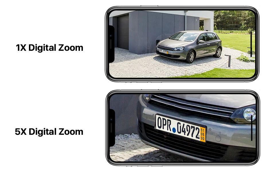 This camera supports 5.0X Digital Zoom, Press and hold the screen with both hands to Zoom in/out and see more details.