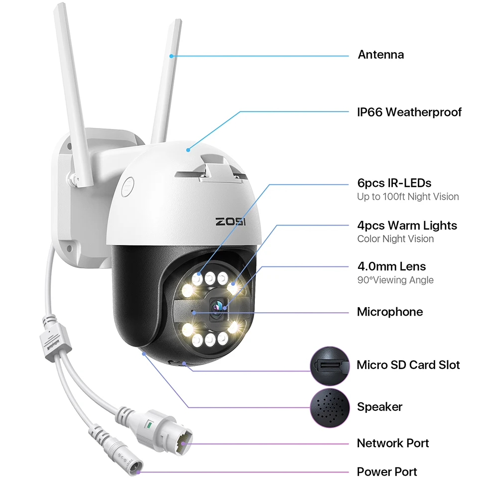 ZOSI C296 PT security camera comes with 6pcs LED lights and 4pcs powerful spotlights, to allows you to see up to 100ft in night. It also support 3 night vision, Black&White night vision, Full color night vision(Color vision all the time), Smart night vision(trigger by motion detection).